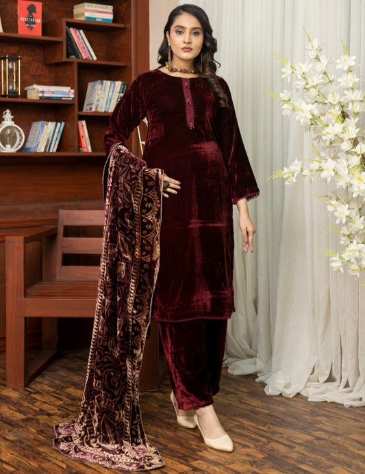 Brit 3 piece luxury Valvet_81042 Pakistani ladies suit Mehroon WITH CHIFFON DUPPATA B291