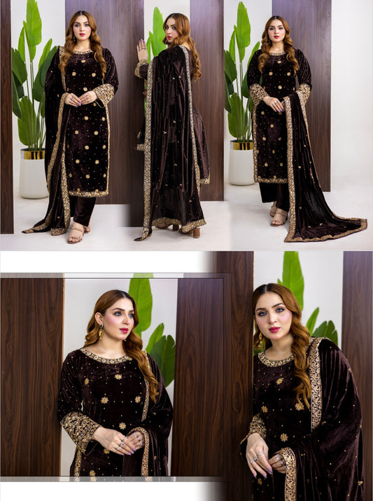 Brit 3 piece luxury Valvet_81042 Pakistani ladies suit chocolate Brown B299