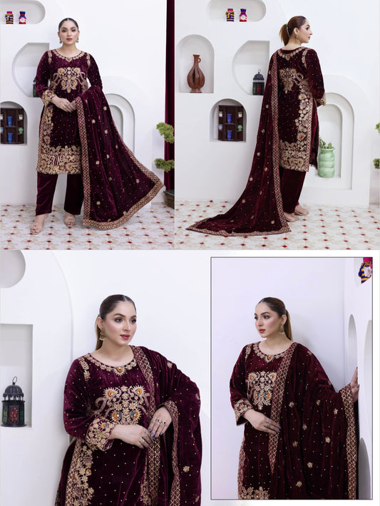 Brit 3 piece luxury Valvet_81042 Pakistani ladies suit maroon B295