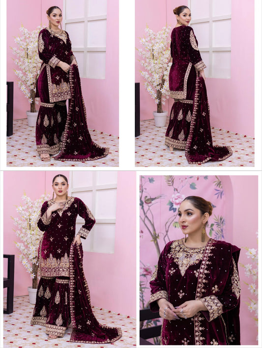 Brit 3 piece luxury Valvet_81042 Pakistani ladies suit maroon B294