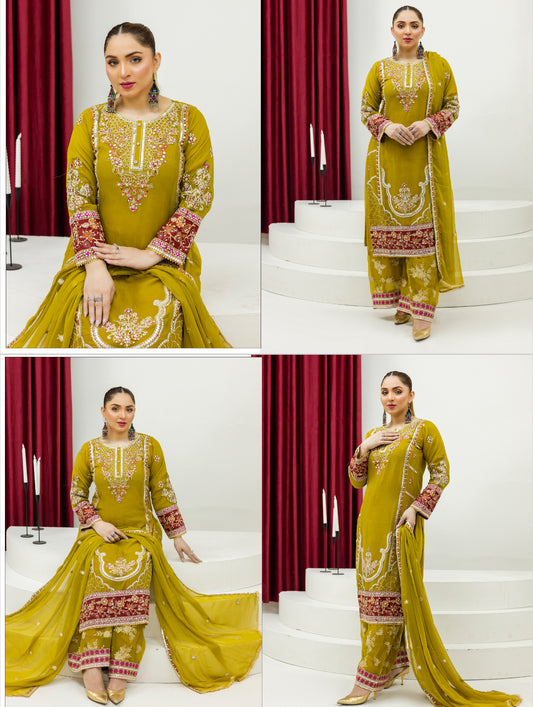Brit 3 piece luxury chiffon_81042 Pakistani ladies suit olive B245